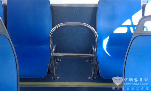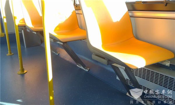 车厢中部是乘客最集中的地方,一般公交车都会在车厢中部低地板区域放置单人座椅。但是,大部分座椅都采用传统直腿造型,即减少了高峰期乘客的脚部空间,也为车辆的打扫带来了麻烦。目前,中通客车产品普遍对该区域座椅采用斜腿造型,并且通过综合验证,其稳定性和可靠性丝毫不弱于直腿造型。