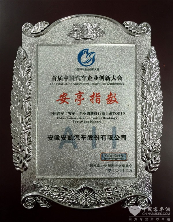 客车企业创新排行榜揭晓 安凯荣登排行榜TOP2
