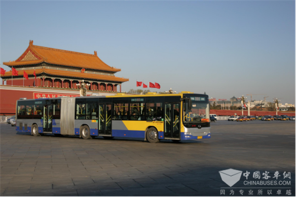 行驶在长安街上的黄海BOB造型公交车