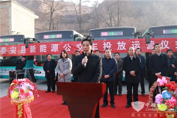 新能源批量上线运营仪式上,秦安县人民政府副县长张海龙致辞时表示,“新能源公交车的批量投放是秦安县委、县政府贯彻落实党的十九大绿色发展精神的新举措,是为广大群众所做的一件民生好事、实事。在全县上下全面贯彻党的十九大精神之际,秦安县32辆海格新能源车辆的投放运营,见证了我县交通运输行业发展的新成果,开启了秦安县城市交通发展的新时代。”
