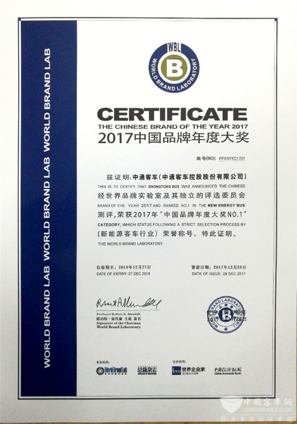 中通客车荣获2017年新能源客车“中国品牌年度大奖NO.1”