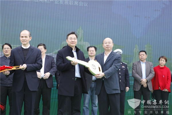 仪式现场领导与金龙纯电动公交合影