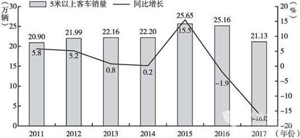 受政策调整的影响,2017年的客车市场演变之精彩程度,相比大起大落的2016年一点也不逊色。图1显示,2016年和2017年,我国5米以上客车市场遭遇了两连降。根据中国客车统计信息网数据,2016年,客车市场累计销售各类车型(大客、中客和轻客)25.16万辆,比上年同期小幅下滑1.91%;2017年,客车市场累计销售各类车型21.13万辆,同比再度下滑16.01%。比起2016年的小幅下滑,2017年客车行业的整体形势,显然要严峻得多。