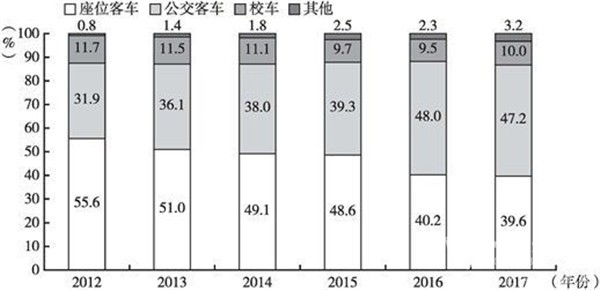 第二,座位客车销量占比连年下降,2017年首次降到40%以下。图2显示,2017年,座位客车和公交客车销量在客车市场整体销量中的占比都有所下滑,座位客车占比更是下降至39.6%。从2012年到2017年这六年间,座位客车的市场占比从55.6%一路下降,2016年同比下降8.4个百分点至40.2%,2017年再度下降0.6个百分点至39.6%。这也是座位客车占比连续第二年低于公交客车。