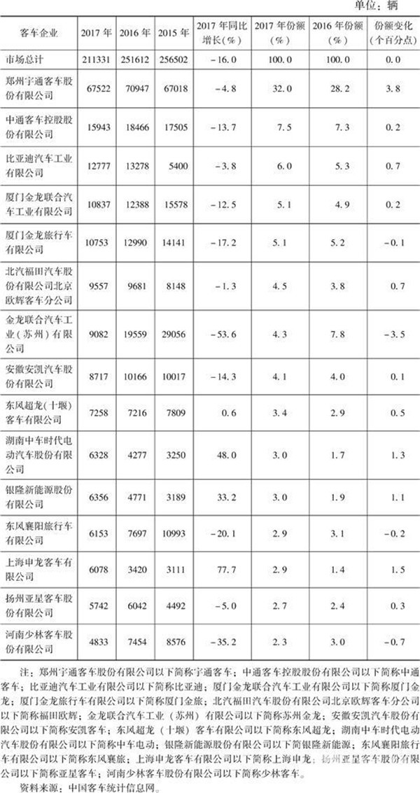 表1显示,2017年,我国5米以上客车市场销量排名前十位的企业市场集中度在稳步提高,第一名宇通客车2017年销售各类客车67522辆,虽然由于市场整体下滑而下降了4.8%,但市场份额从2016年的28.2%提升到32%,提高了3.8个百分点;宇通、中通和比亚迪行业前三强的合计市场份额从2016年的40.8%提高到45.5%,提高了4.7个百分点;客车行业前六强(宇通、中通、比亚迪、厦门金龙、厦门金旅和福田欧辉)的合计市场份额在2017年提高了5.5个百分点。可见,随着国家对客车尤其是新能源客车技术标准要求的提高以及客户需求的日益理性,优势客车生产比亚迪凭借其优秀的产品品质、安全节能的技术优势以及强大的品牌影响力,正逐渐从市场上胜出,攫取更多的销售量与市场份额。这些龙头企业和优势企业的发展壮大,对于客车行业的技术进步以及道路交通运输的安全管理都具有积极的正面促进作用。