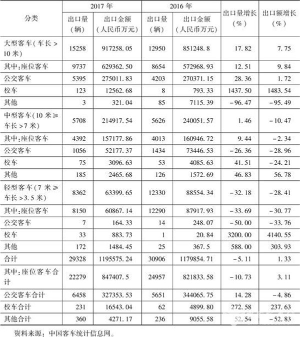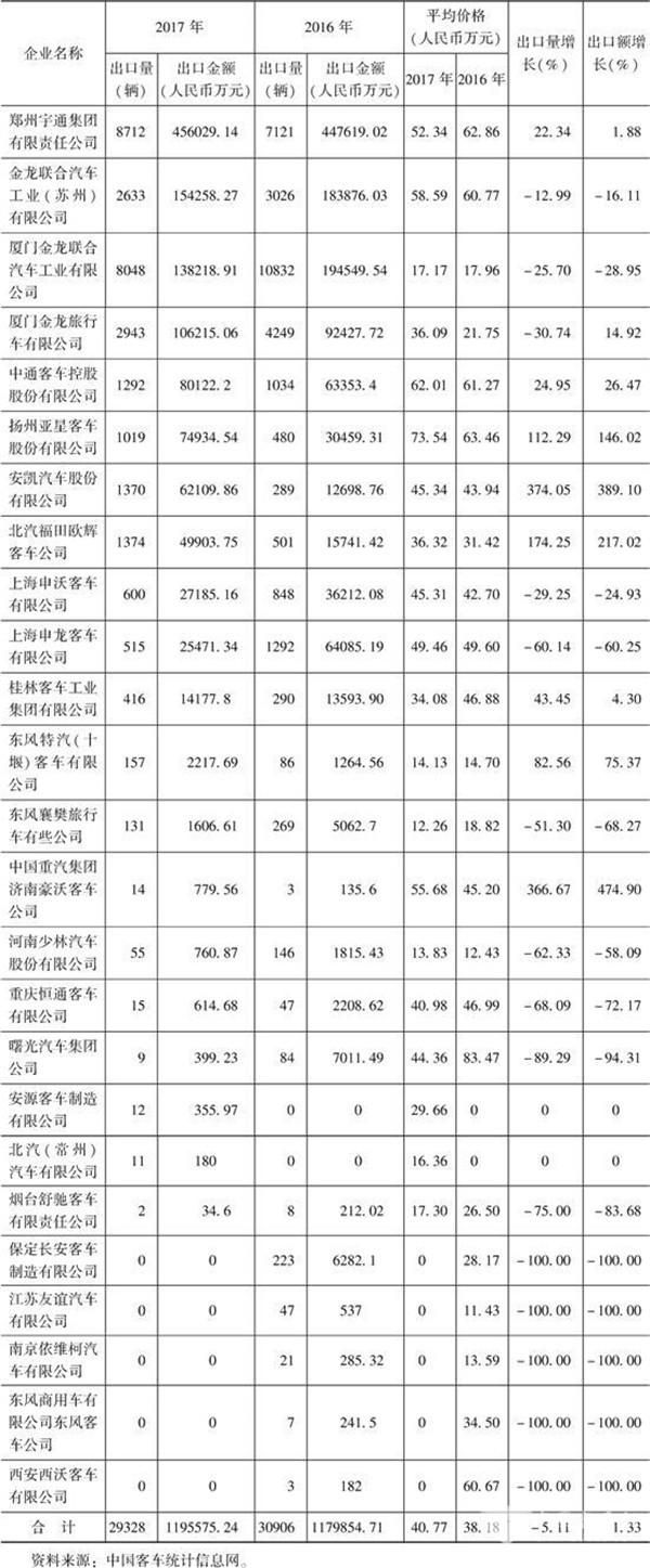 表3 2016~2017年中国客车企业出口量及出口金额一览