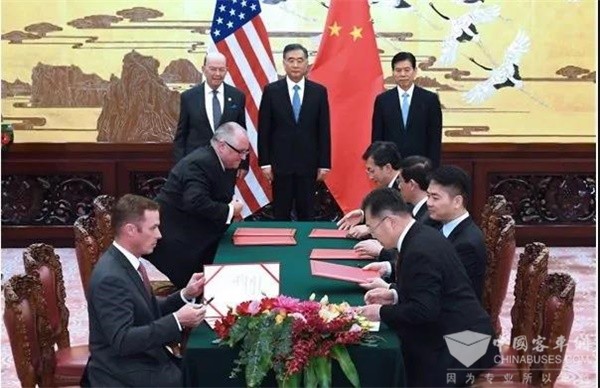 11月份,在美国总统特朗普访华期间,在中美两国CEO商务代表团见证下,中国第一大商用车集团——福田汽车集团,与美国TDG集团双方共同签署了未来公共交通工具智慧城市解决方案合作备忘录,福田欧辉作为此次签约的有效载体,更是成为了本次中美经贸签约中,中国汽车工业走向世界唯一代表,在构建全球交通领域“绿色、智能”大格局的同时,树立了中美智慧交通合作的典范。