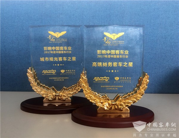 2018年1月12日,第十二届影响中国客车业系列活动颁奖现场,安凯宝斯通K7、安凯纯电动双层敞篷观光客车分别荣获“高端商务客车之星”、“城市观光客车之星”两项大奖。