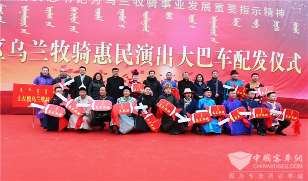 仪式上,乌兰牧骑代表接过了演出大巴金钥匙,从此,素有“红色文艺轻骑兵”美誉的乌兰牧骑,首次拥有了专属演出大巴。这批美观舒适的演出大巴,将极大地便利乌兰牧骑驰骋辽阔草原、走向全国,进行下乡演出及全国巡演,进一步发扬乌兰牧骑精神、壮大乌兰牧骑文化事业。