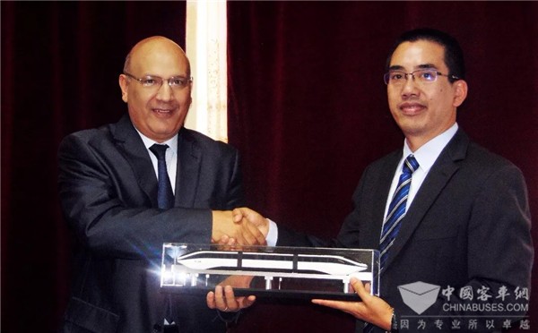 去年10月,比亚迪中东非洲汽车销售事业部总经理黄志学(右)将云轨模型赠与埃及亚历山大客运局长Khaled Eleiwa。