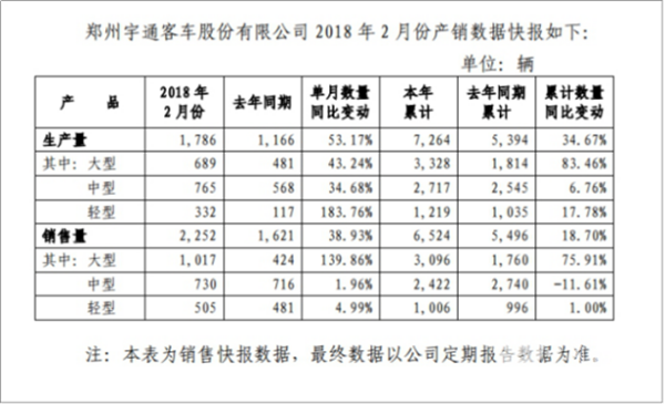 从各细分车型来看,宇通2018年2月份生产大型客车689辆,相较2017年同期单月同比增幅达到了43.24%;2018年2月份,宇通大型客车销售1017辆,虽然较去年同期424辆的销量同比增幅近140%,整体增势迅猛。2018年1-2月,宇通累计生产大型客车1814辆,累计销售大型客车1760辆,分别实现了83.46%和75.91%的巨大增幅,也正是大型客车产销两旺的表现,直接拉动了2月份产销态势。
