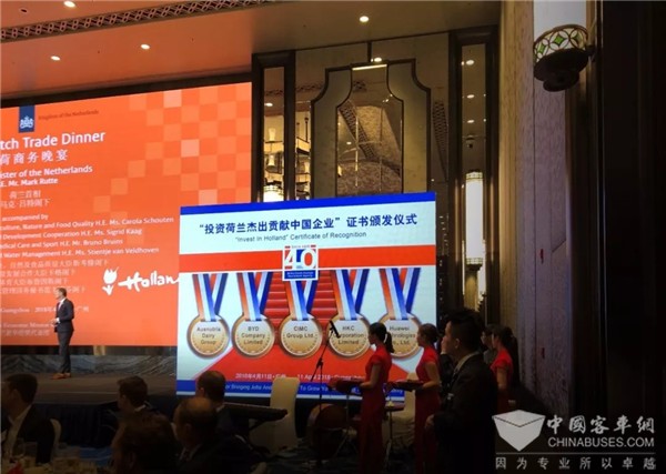 荷兰首相访华期间,正值荷兰外商投资局建立40周年,荷兰驻广州总领事馆在广州举办中荷商务晚宴,比亚迪应邀出席。晚宴上,在荷兰首相马克·吕特和广东省省长马兴瑞的见证下,荷兰外商投资局局长倪景润(Jeroen Nijland)特颁发此奖给全球最大的电动汽车制造商——比亚迪。