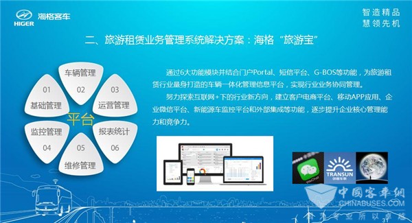 从解决方案着力点看,海格打造的客运转型旅游用车整体解决方案,包括客运转型旅游用车细分产品解决方案和旅游租赁业务管理系统解决方案,旨在实现从选车、买车到用车、养车全覆盖,并且全程量身定制。其中,客运转型旅游用车细分产品解决方案涵盖城市内景点旅游班线车、“城市间”和“城市内—城市外景点”旅游包车、景区内观光车、定制化旅游观光用车等多样化、全系列车型需求。