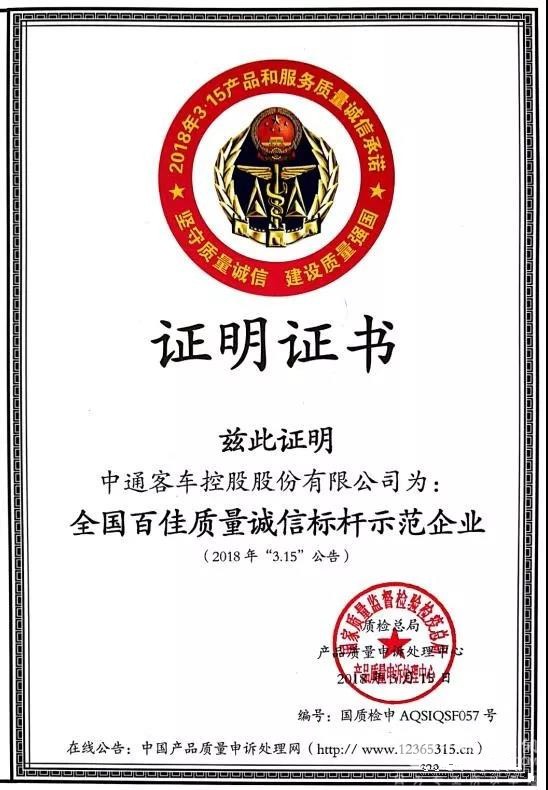 在经历了严格的评选和考核之后,近期,国家质检总局正式授予中通客车“全国百佳质量诚信标杆示范企业”的荣誉称号。