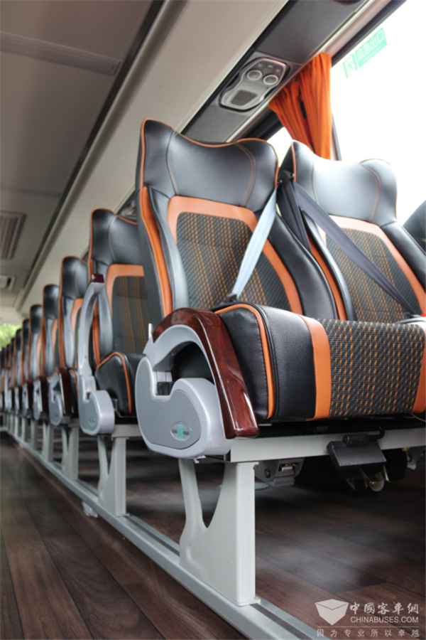 座椅是客车内占据空间最大也是最能体现内饰风格的配置,新凯歌放弃了原有稳重的商务风格,采用了赛车风格的座椅,这一大胆的设计赢得了各方认可。在巡展现场,多位客户都对新凯歌的内饰变化感到惊讶,尤其对座椅设计表示认可。新凯歌的座椅采用带状造型,富有包裹性的设计贴合人体坐姿,复合材料的面料既显档次又不失舒适,整体配色也很跳跃,符合了当前很多从事旅游业务客户的需要。