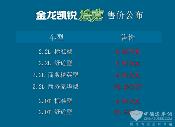 凯锐浩克以领先同级车的3350mm超长轴距和1540mm(内部高度)半高顶设计,营造了宽绰的车内空间。内饰设计实用主义风格,采用上浅下深的色彩搭配,简约而不简单。轿车化仪表台设计,四辐方向盘、中控大屏集成倒车影像和音像、前窗电动调节等,提升了驾乘的品质性和操控性。整车可选2-10座,配备五种不同造型和面料的座椅供客户选择,座椅可折叠侧挂或前翻,灵活多变。在场不少来宾上车感受车内的舒适性过后,都给出了一致的好评。