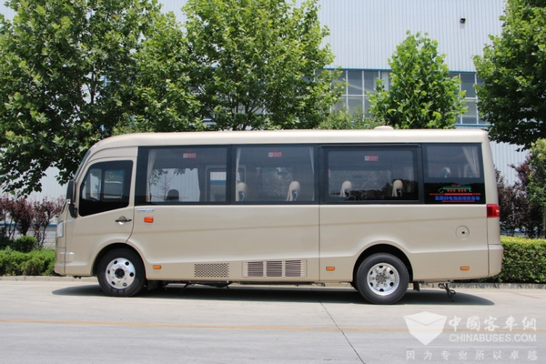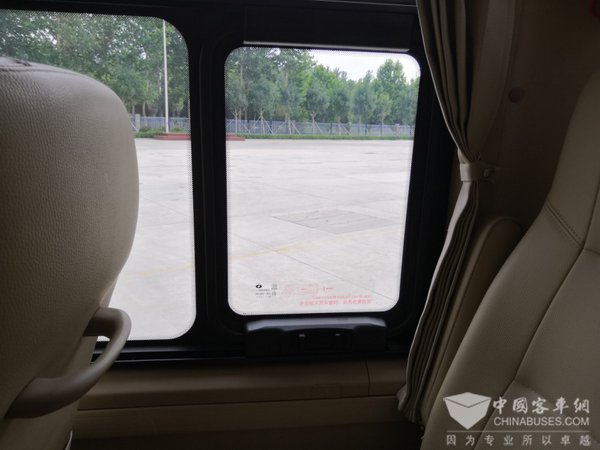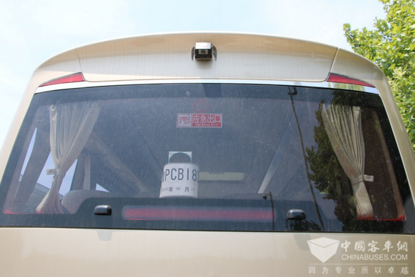 在车身后侧,两边各设置了一块气撑杆式自动外翻窗,方便了遇到危机情况时的紧急逃生。配以安全锤的使用,进一步保障了乘客的安全性。同时,车身最后一块窗户可以打开,方便车内的换透气。