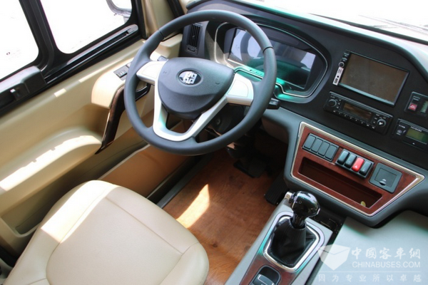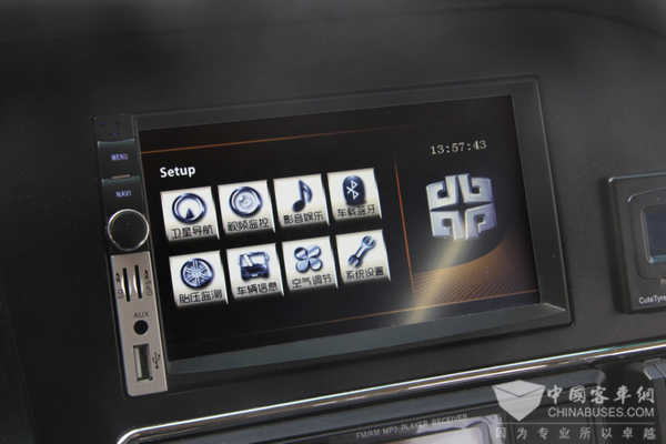 观摩中通中通高端商务的驾驶区,一个直观的感受就是按钮比较少。整体采用多主控制的理念,如采用的CAN通讯的多媒体主机,实现多功能的集成控制,将室内等、蓝牙、导航、倒监、影音、空调、暖风、车内环境系统等功能控制都集中在这个7寸多功能彩屏中。如此集成设计,可减少车体内线束和控制器的接口数量,避免互相干涉、磨损等隐患,降低整车电气系统的故障发生率。