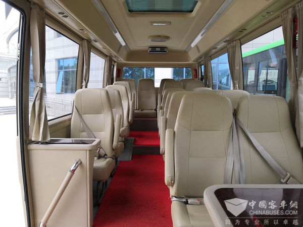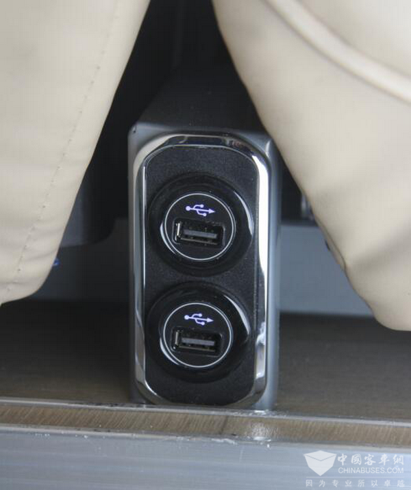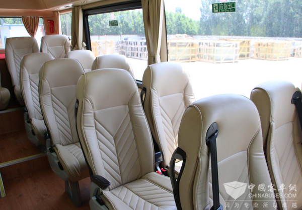 乘客座椅采用了人体工程学设计,在保证良好舒适度的同时,也兼顾了对人身体的支撑性。座椅靠背100-125°可调节,并且还配备有扶手。每一个座椅的后方均设计有安全扶手,方便乘客在行经颠簸路段时使用。另外,椅背后方均设计有储物袋,方便后排乘客储备报刊杂及零食饮料等物品。同时还实现了安全带未系报警、USB充电等功能。据观察,前排个座椅为三点安全带,后面则为两点卷收安全带。