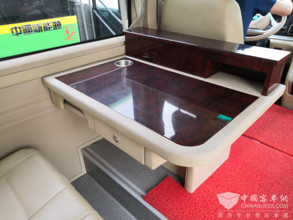 中通氢燃料商务车不仅在车辆左侧首个座椅处装配了一个办公桌,在右侧也配置了一个小办公桌,有水杯槽、储物柜以及220V电源接口,极大地方便了移动商务办公的需要,极大提升了商务接待的服务水平。