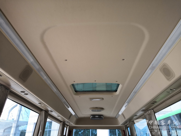 车厢内部配备有LED贯通顶灯,以及四只大功率扬声器(乘客区前、后各两只)。灯内配有氛围灯,灯体可进行半亮-全亮控制。同时,在车顶,中通客车设置了可遮挡的天窗、换气口、天窗安全锤以及车载空气净化器等。