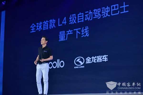 2018年7月4日,百度 AI 开发者大会(Baidu Create 2018)上,在7000余名开发者面前,李彦宏兑现了自己一年前“吹的牛”:全球首款 L4 级量产自动驾驶巴士“阿波龙”量产下线!