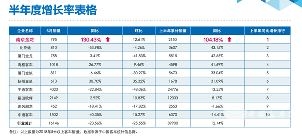 根据中国客车统计信息网统计,南京金龙2018年6月销量795台,同比增长130%,上半年累计销量2150台,同比增长104%,上半年同比增长率行业排名第一,成为2018年上半年行业内唯一一家同比双增长的企业。
