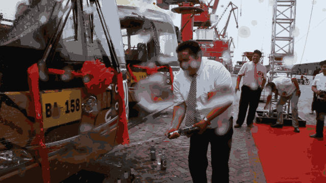 仪式结束后,按当地习俗,满怀喜悦的玻利维亚友人以美酒为即将装船出口的34辆新车“洗礼”表示庆祝。这是他们第三次远道而来,如此热情地迎接金龙客车远航玻利维亚。