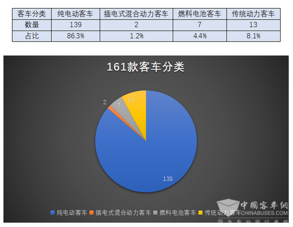 XINGKONG.COM了解到,申报本批《公告》的客车产品共161款(含底盘)。其中新能源客车有148款,占比91.9%。从车型来看,纯电动客车139款(含有18款纯电动客车底盘),依然是新能源客车主流;插电式混合动力客车仅有2款,相比第310批的9款明显减少;燃料电池客车7款,传统动力客车13款(含有5款客车底盘)。