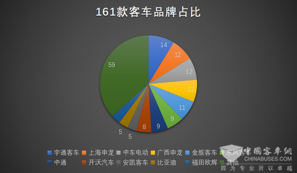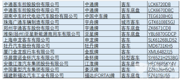 从客车品牌看,宇通客车申报14款客车,位列榜首;上海申龙、中车电动、广西申龙分别申报12款客车,位列第二;金旅客车申报11款客车,位列第三;中通客车和东风客车分别申报9款产品,位列第四;开沃汽车申报8款客车产品,位列第五; 安凯、比亚迪、福田欧辉分别申报5款客车,位列第六;另外,天津比亚迪、北奔、金龙客车、海格客车、大汉、奇瑞万达、陕汽、浙江中车等都有多款产品申报。