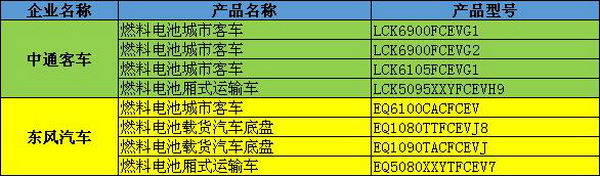 中通客车除了包含3款燃料电池客车产品以外,还包含一款燃料电池厢式运输车在列;而东风汽车除了一款燃料电池客车车型以外,另有其他三款入选产品,分别为一款燃料电池厢式运输车和两款燃料电池载货汽车底盘。