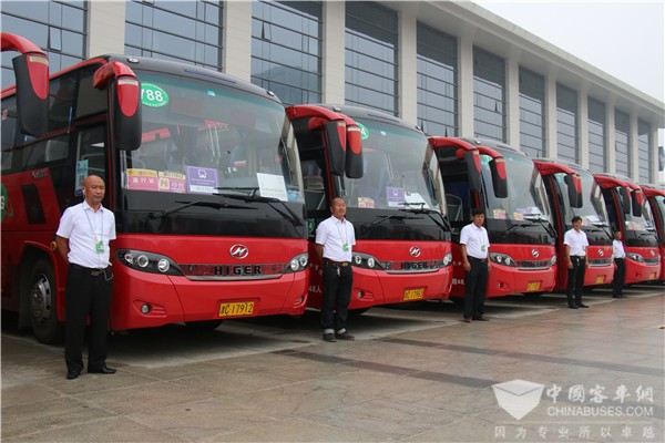 亮红色海格客车成为穿梭于会场之间的“流动风景”
