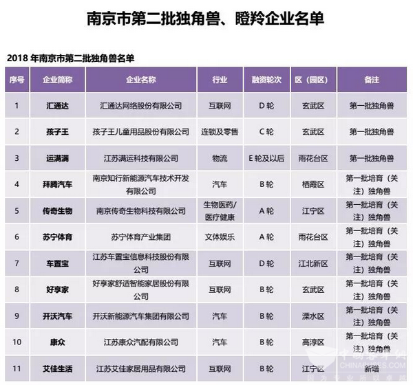 会上,2018年南京市第二批独角兽、培育独角兽、瞪羚企业榜单正式发布,共有11家独角兽,52家培育独角兽和87家瞪羚企业入围。开沃汽车成为新晋独角兽,正式迈入独角兽阵营。