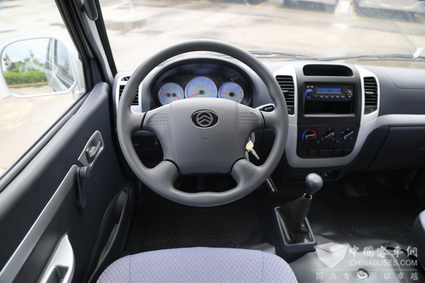 由于“新时代”和海狮一样主打的都是性价比产品,所以说驾驶室内部依旧保持了简洁实用的造型。由于我们拍摄的这辆新时代采用的是主打性价比的配置,所以车窗为手摇式升降,当然用户可以根据配置需求来选择电动升降车窗以及电动后视镜调节。四副式方向盘还是秉承着实用为主的造型,上面只安装了喇叭按键。变速箱挡杆也是非常熟悉的样子,操作也十分轻便。
