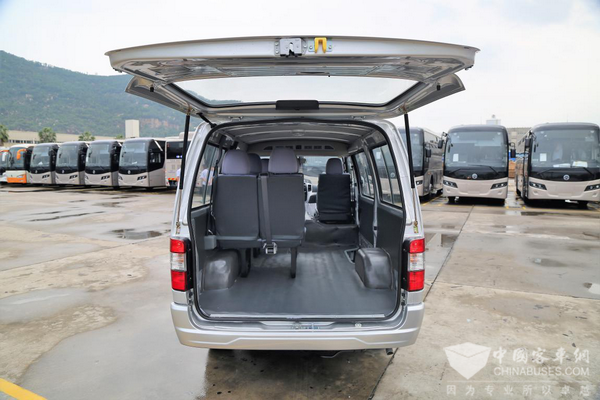 中间的推拉门也是海狮车的特色设计了,从这个角度看去后面安装了四张座椅,座椅都是利用支架直接固定在车厢地板上,每个座位均配有三点式安全带。二级踏板也是海狮系列车型的特色,而“新时代”也保留了这个特色,非常方便人员上下车。