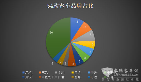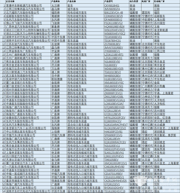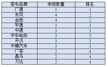 从客车品牌看,广通牌客车申报5款,位列榜首,车辆由兰州广通新能源汽车有限公司和珠海广通汽车有限公司生产;金旅牌和东风牌客车分别申报4款,位列第二,其中金旅客车由厦门金龙旅行车有限公司和湖北三江航天万山特种车辆有限公司生产;宇通、中通、中车电动、开沃汽车、中植汽车都申报了3款产品;另外,比亚迪、安凯、海格、晶马、申龙、广客、万达等都有1-2款客车申报。