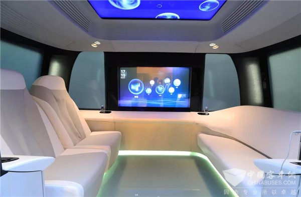 阿波龙“智能驾舱”集顶尖高科技智能化设备及智能家居于一身,概念式航空舱布局,装配显示车窗玻璃屏、全景智能液晶车顶,智能感应灯光系统,按摩沙发、环绕立体音响等,带来全方位的娱乐体验和氛围烘托。