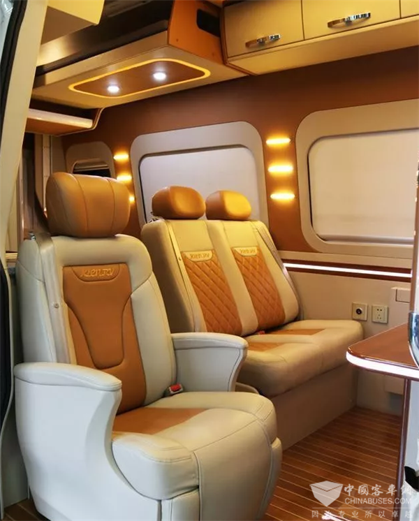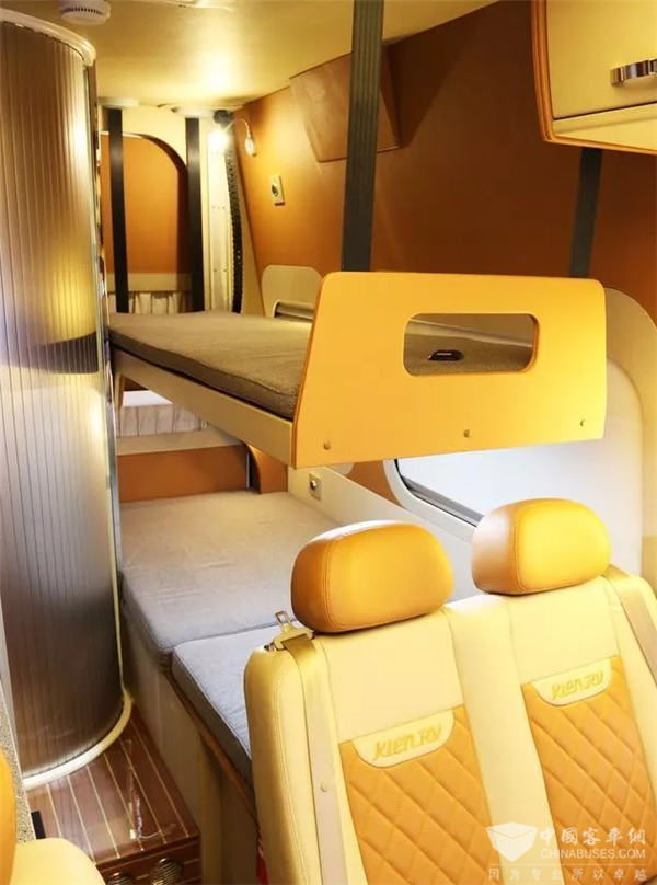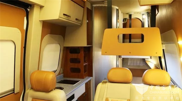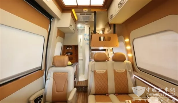 驾驶室与车厢后方为当下流行的前后贯通式结构,有两种布局可选,一种是适用于高端商务用车的后卡座式布局,另外一种是适用于居家旅行的后纵置上下铺布局。内饰均采用高档柚木地板搭配皮质家具,尽显高端品质。