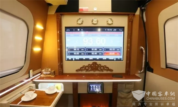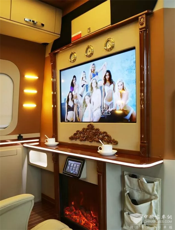 两侧都有很大的车窗,车前部的驾驶室后方采用了隔断,40英寸可电动升降电视嵌在隔断里,电视上面镶嵌英伦风的时钟和温度、湿度表。电视下方壁炉的设计更是增添了欧式风格,尽显高档。