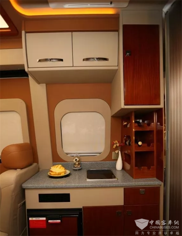 一体式厨房区域设置在车门左侧,空间较小,嵌入式电磁炉能满足日常做饭所需,洗菜池带有盖子,不用时还可以放置物品。洗菜池旁边还专为放红酒设置的储物格,心思巧妙。橱柜下方的专用冰箱可以保鲜食物及冰镇饮料。