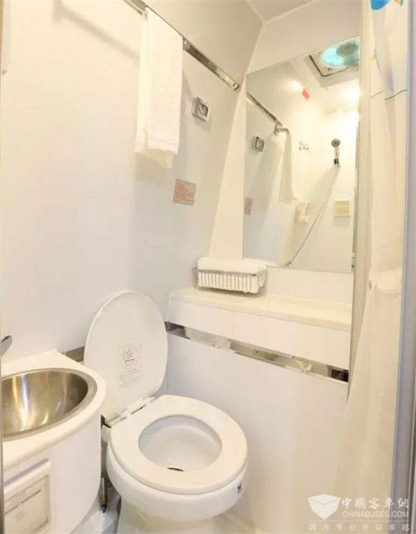 床旁边为一体式卫生间,配置有独立面盆、一体式水龙头淋浴花洒、电控粉碎式马桶等,带有110L净水箱,90L污水箱。合理的格局规划,齐全的功能配置,带给你舒适的洗漱环境。