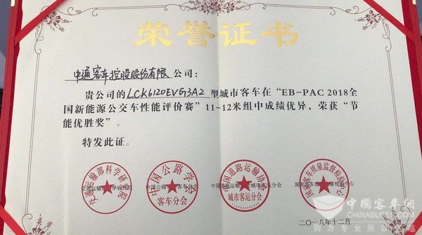 2018年12月1日,在重庆举行的“2018全国新能源公交车性能评价赛”(以下简称EB-PAC评价赛)结果揭晓,中通LCK6120EVG3A2在11-12米参赛车辆组中脱颖而出,一举斩获“节能优胜奖”和“续航里程优胜奖”两项大奖,再次印证了公司在新能源客车领域的技术实力和行业领先地位。