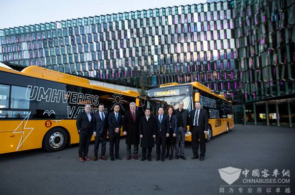 冰岛交通部长、中国驻冰岛大使、冰岛首都公交公司董事长、冰岛前外交部长、宇通海外市场副总经理等人在宇通纯电动车前合影