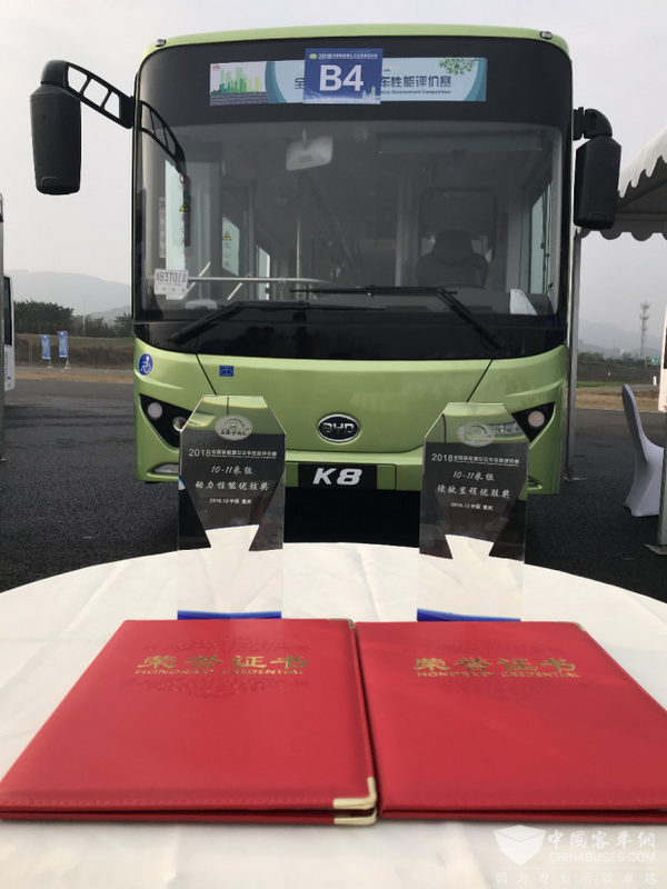 2018年11月29日—12月1日,2018年全国新能源公交车性能评价赛在重庆机动车强检试验场圆满举行,吸引了国内十多家主流客车厂的近20款新能源车型参加。比亚迪携旗下“销冠车型”——K8纯电动公交车出征,得益于全球领先铁电池、轮边驱动、电机控制系统等核心技术,K8各项性能表现出色,以超强产品力一举斩获续航里程优胜奖、动力性能优胜奖两项大奖。