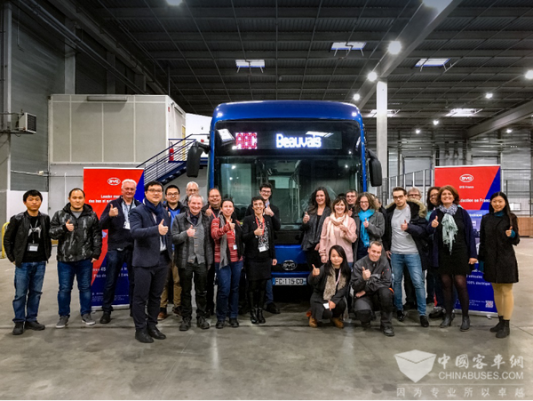 比亚迪法国工厂员工与首台下线纯电动大巴合影