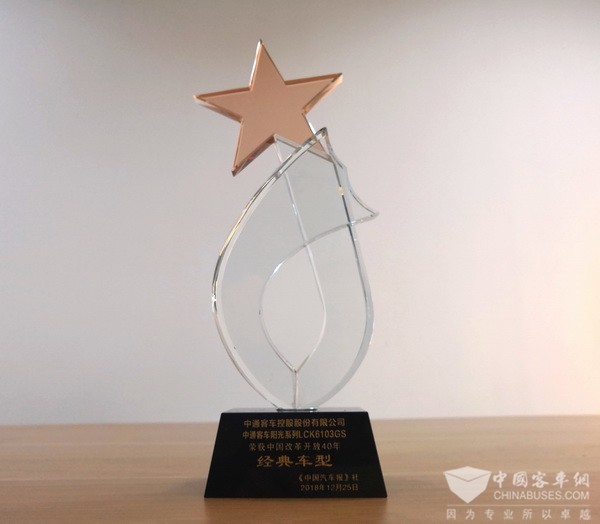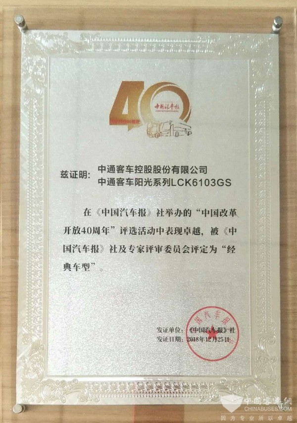 2018年12月25日,由中国汽车报主办的“与改革开放同行,中国商用车市场市场巨变40年”颁奖典礼活动在北京渔阳饭店隆重举行。会上,对改革开放40年来表现优异的卡车、客车、物流车企业进行了表彰,其中,中通客车阳光造型客车LCK6103GS获颁改革开放40周年经典车型。