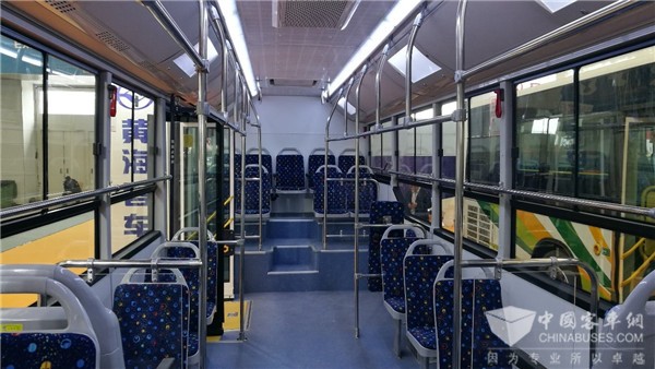 在内饰布置上,DD6109EV采用长轴距及短后悬结构,内部空间宽敞,承载能力大,乘员数相同的情况下乘坐舒适性好。值得一提的是,车顶装配了无动力电池,空调车时可设置2个带换气扇的安全天窗,保证关闭侧窗使用空调时车内空气能够循环流通,为乘客提供健康舒适的乘坐环境。