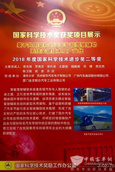 2019年1月8日上午,2018年度国家科学技术奖励大会在北京隆重举行,习近平、李克强等党和国家领导人出席大会,为获奖代表颁奖。金龙客车与清华大学等单位联合研究的“基于结构共用的汽车智能驾驶辅助系统关键技术及产业化”项目,喜获国家科学技术进步奖二等奖。金龙客车因此成为福建省唯一获此殊荣的整车企业。
