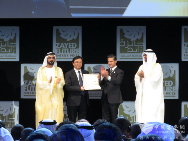 2014年,比亚迪王传福获得“扎耶德未来能源奖”个人终身成就奖领奖画面