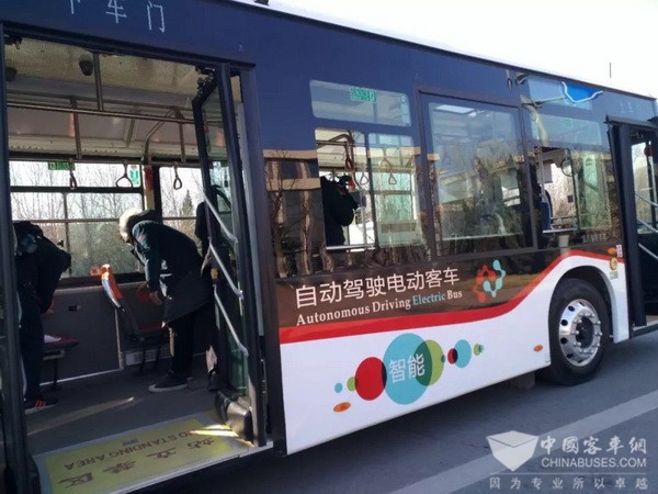 上午10:00,中国重汽无人驾驶公交车驶入科远路进行调试,沿测试道路行驶。该车车身为白蓝色,车身两侧印有“自动驾驶电动客车”字样。